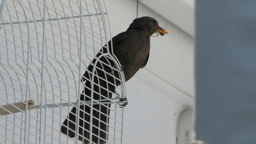 Hoje, quarta-feira, depois de ter pendurado a casa com o “Melro Meco”, observámos que “ o “Melro Pai” e o “Melro Mãe” continuavam a responder à mãe natureza dispensando a comida destinada aos melros domesticados.