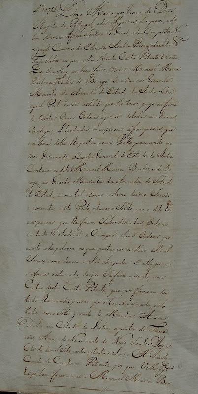 Dona Maria por Graça de Deus, Rainha de Portugal e dos Algarves dáquem e dálem mar em Africa Senhora da Guiné e da Conquista Negociação Comércio da Etiópia Arábia Pérsia, e da Índia Nossas.